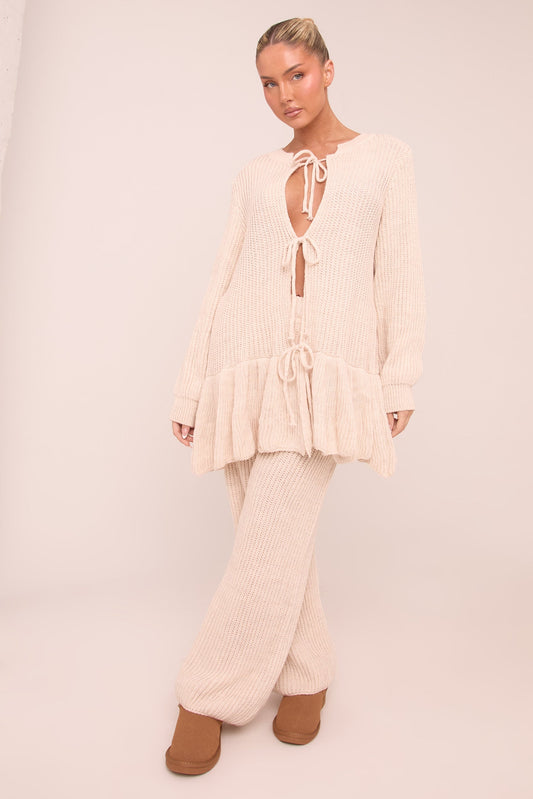 Beige Knit Tie Front Frill Hem Cardigan & Straight Leg Trouser Loungewear Co-ord Set - Julianna