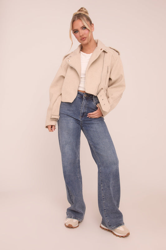 Beige Zip Detail Brushed Biker Jacket - Alisha