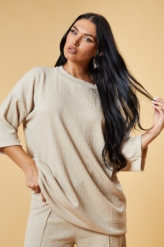 Beige Textured Knit Trousers & Oversized Top Co-ord Set - Cecelia