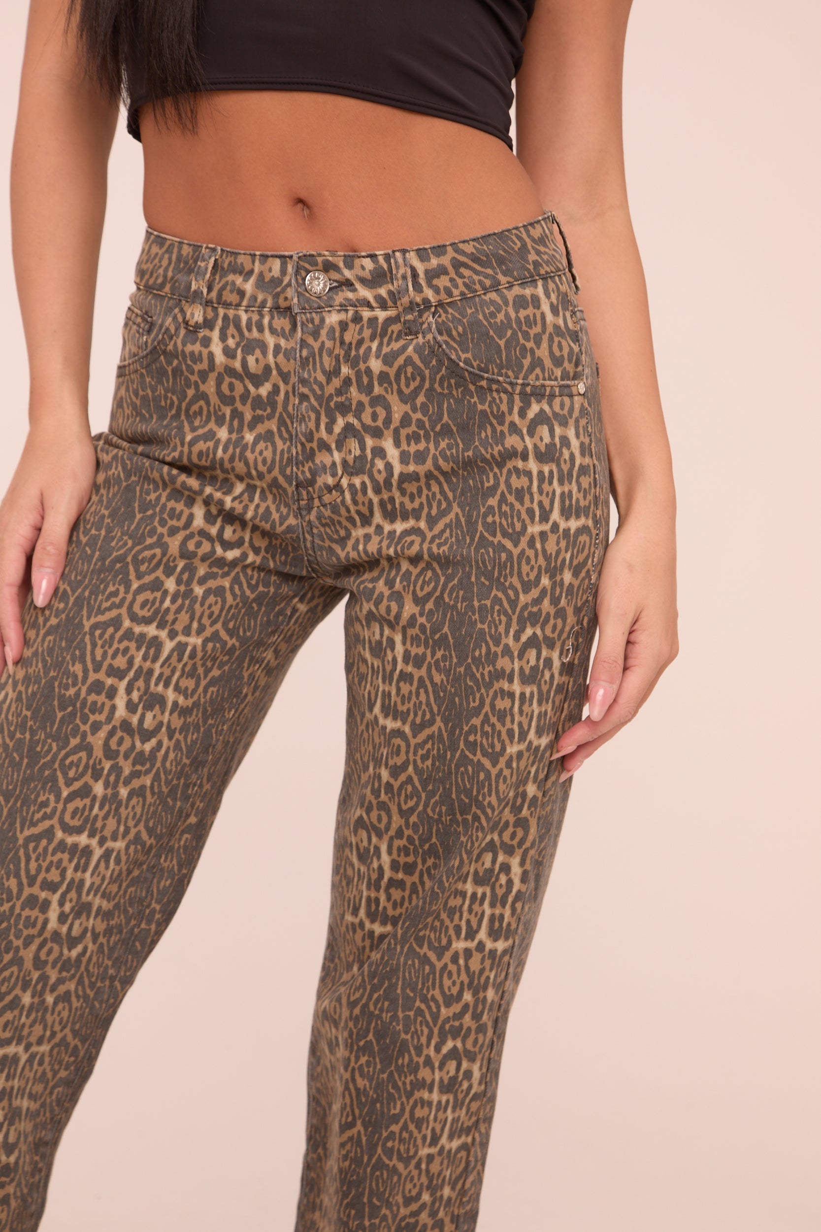 Beige Stretch Leopard Print Mid Waist Straight Leg Denim Jeans - Denise