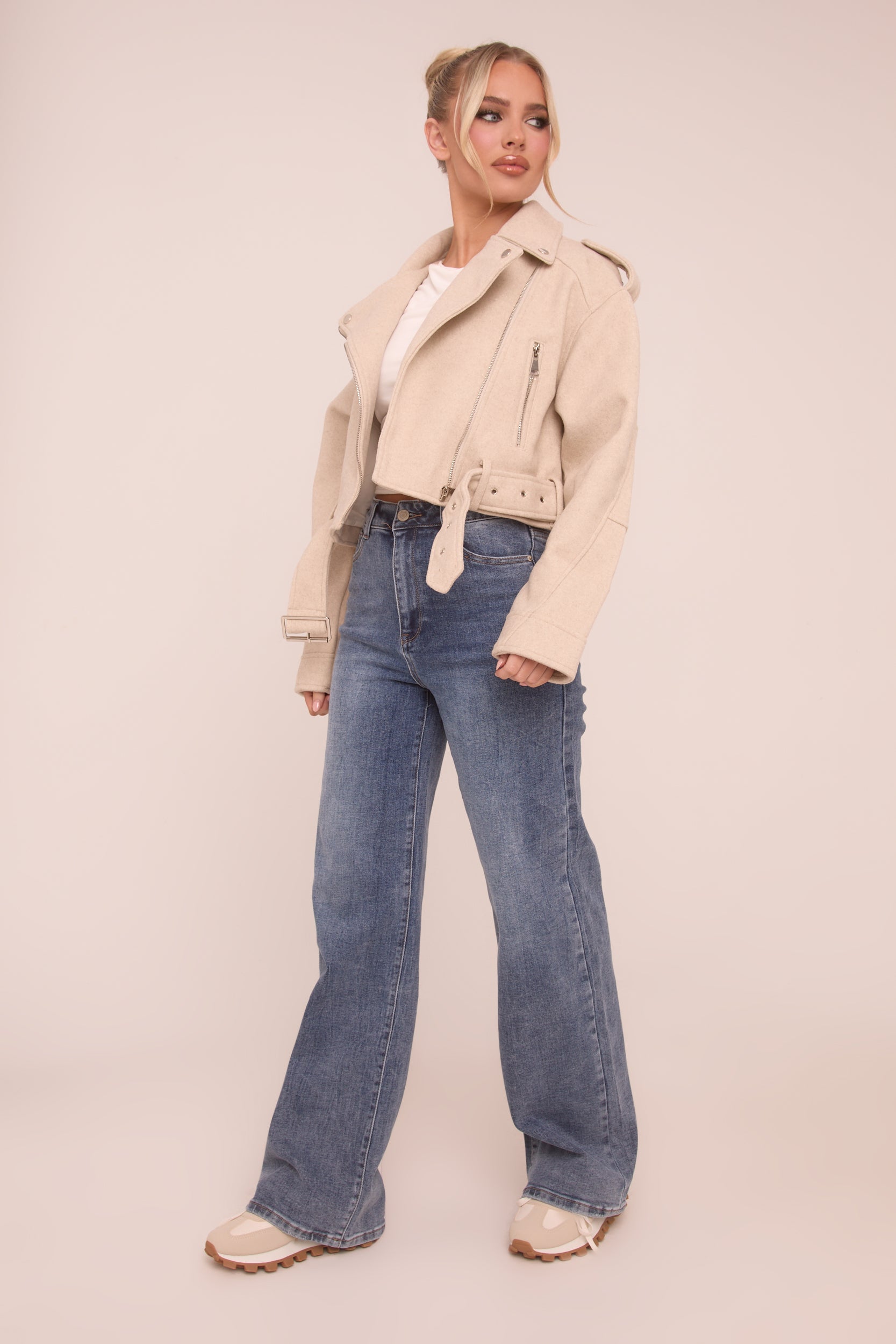 Beige Zip Detail Brushed Biker Jacket - Alisha